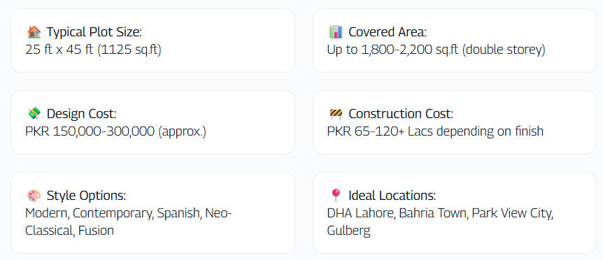 Design fees for a 5 Marla house start from PKR 150,000 and can go up based on detailing, elevations, and 3D visualization requirements. The grey structure construction cost in Lahore and Islamabad for 5 Marla homes ranges from PKR 2,800 to PKR 3,500 per sq.ft., while finishing costs can range between PKR 4,000 to PKR 6,000 per sq.ft., depending on the materials and design choices.